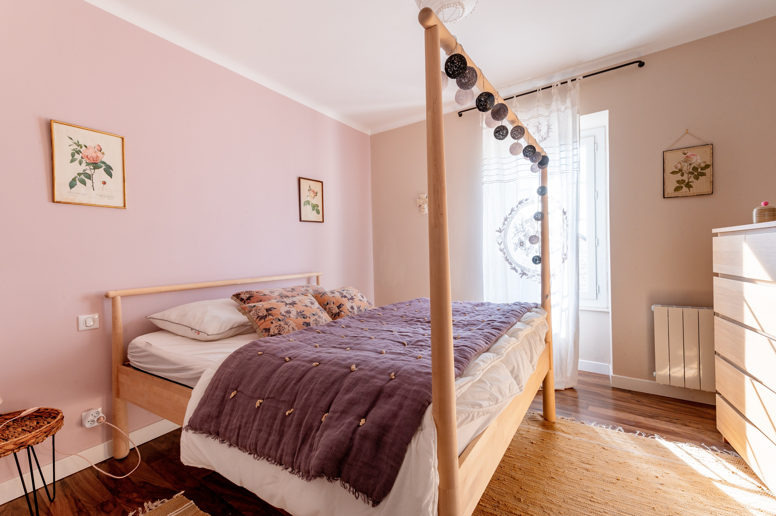 • Chambre 1 (vue Ouest) : lit double 140 cm, vue dégagée sur la campagne, avec ventilateurs