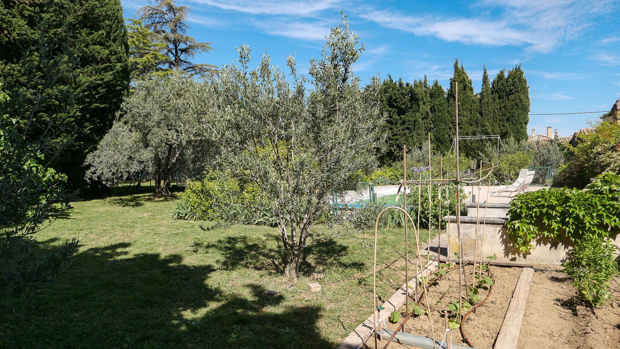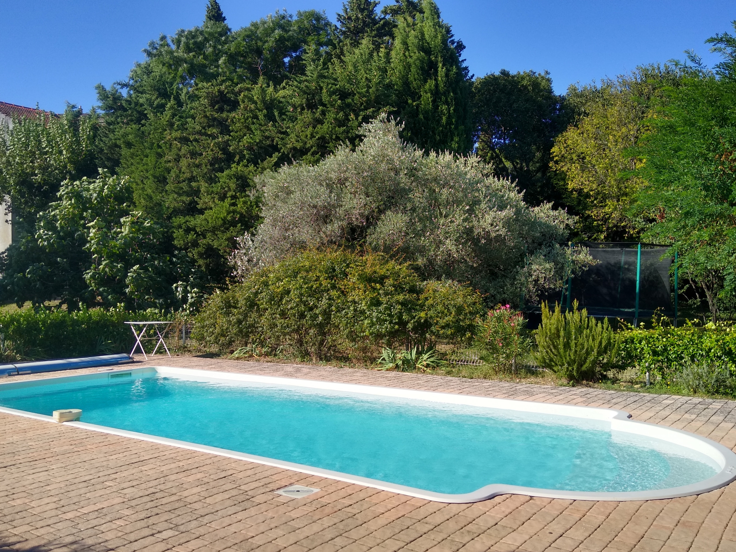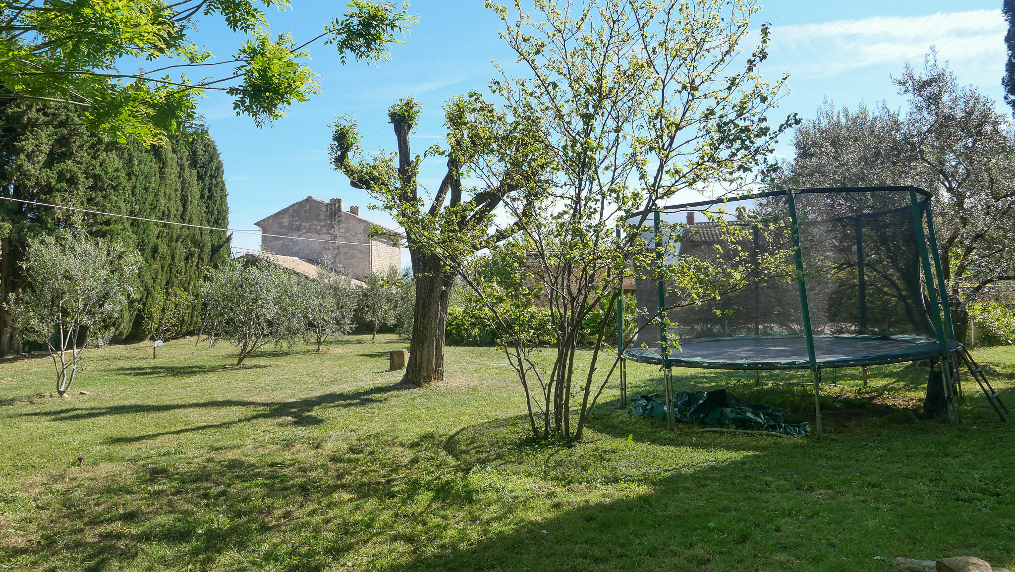 o Trampoline, arbres fruitiers, potager