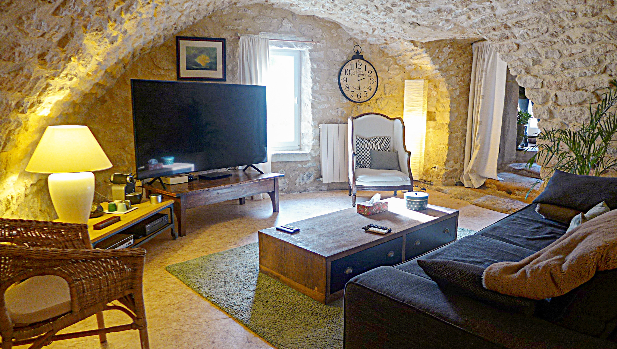 - Une pièce voutée en pierre, fraîche en été, aménagée en salon TV ou espace bureau