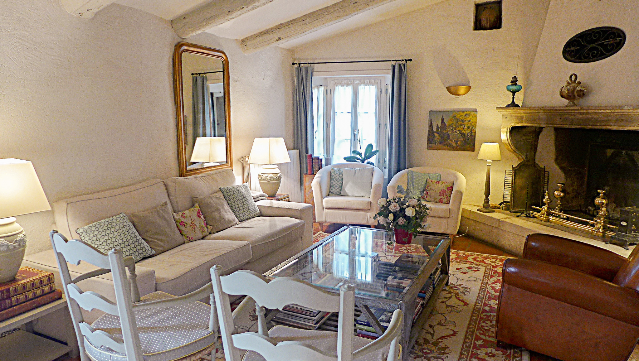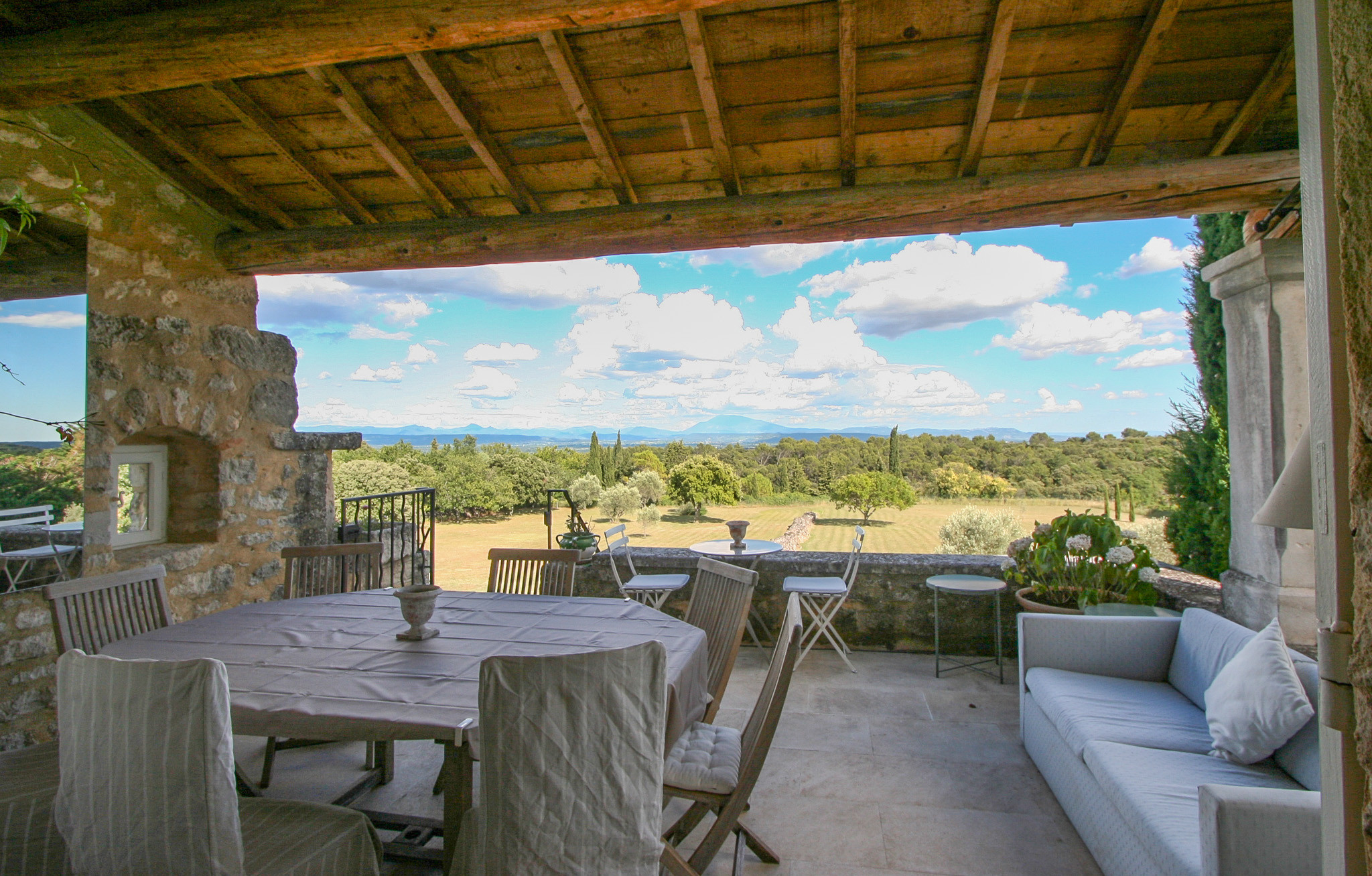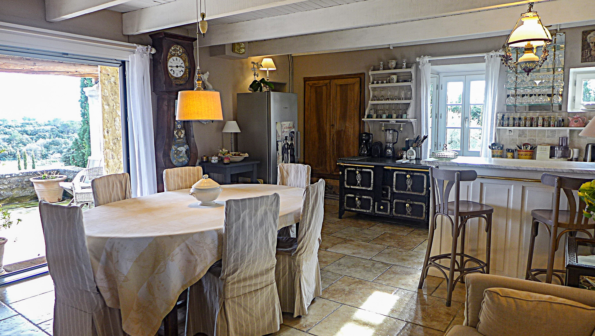 - Le salon avec cheminée et la cuisine entièrement équipée s’ouvrent sur une grande terrasse, idéale pour les repas en plein air ou simplement pour admirer le coucher du soleil sur la Provence,