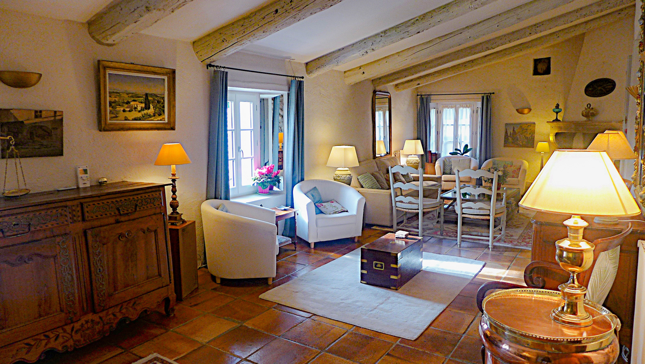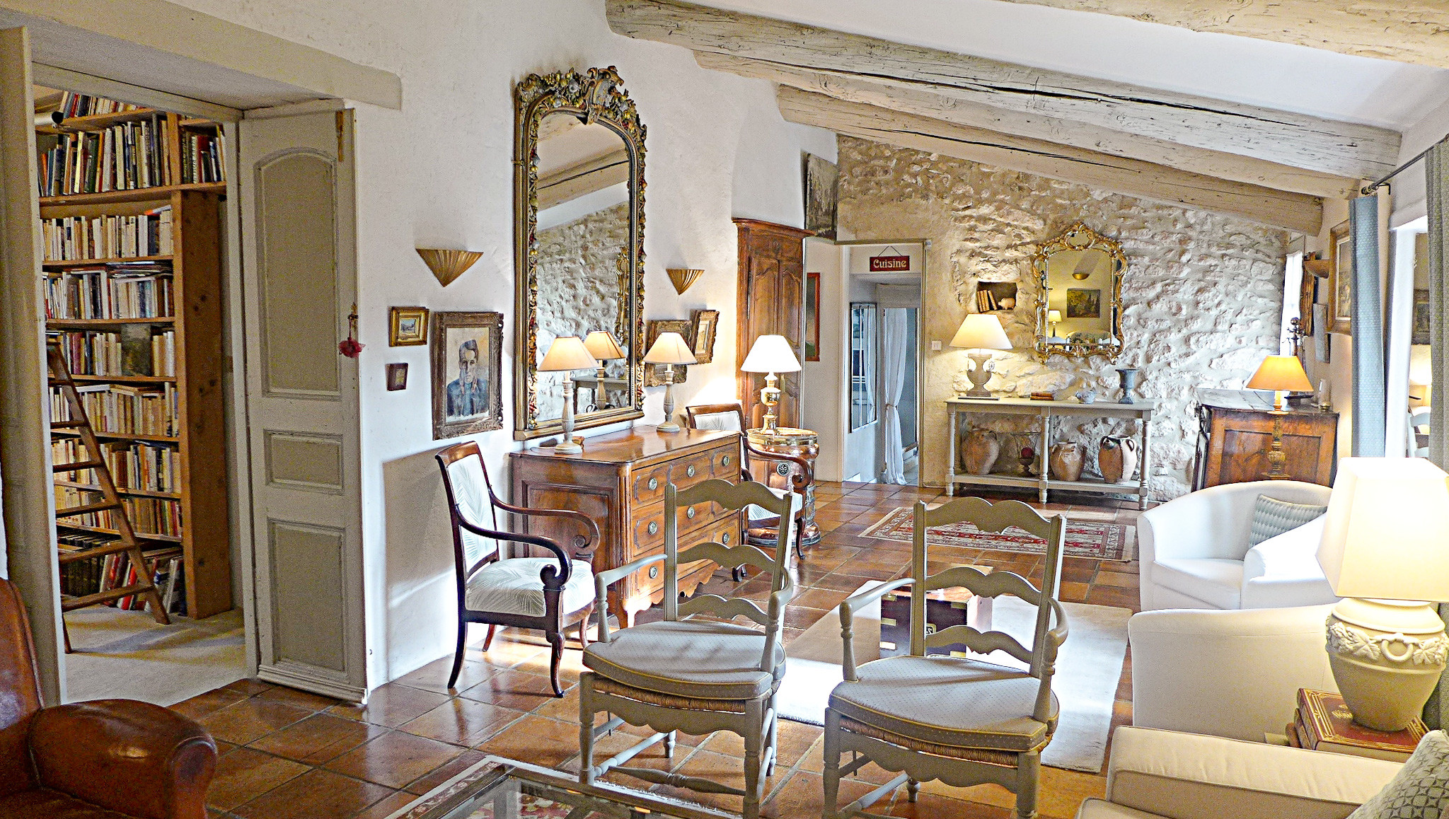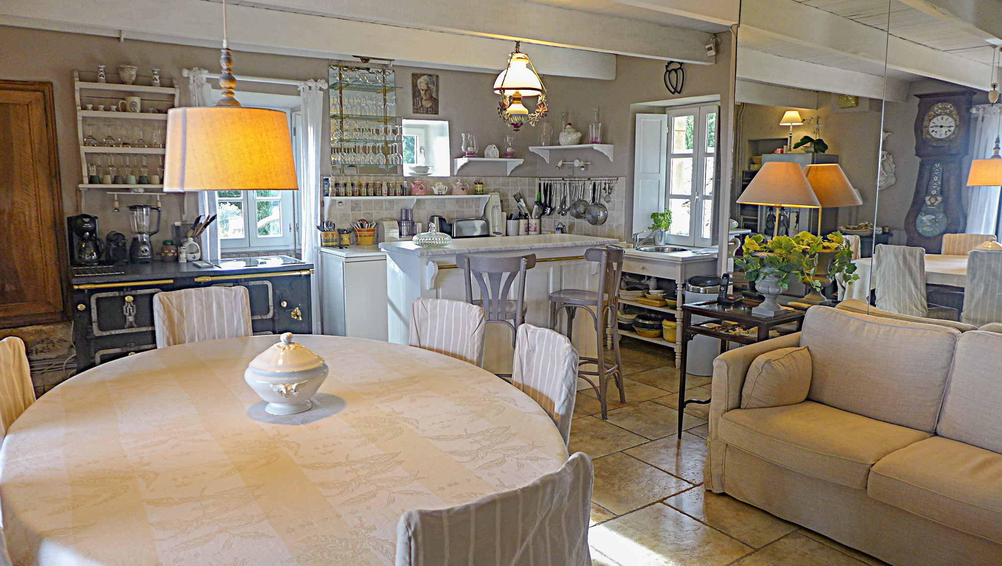 - Le salon avec cheminée et la cuisine entièrement équipée s’ouvrent sur une grande terrasse, idéale pour les repas en plein air ou simplement pour admirer le coucher du soleil sur la Provence,