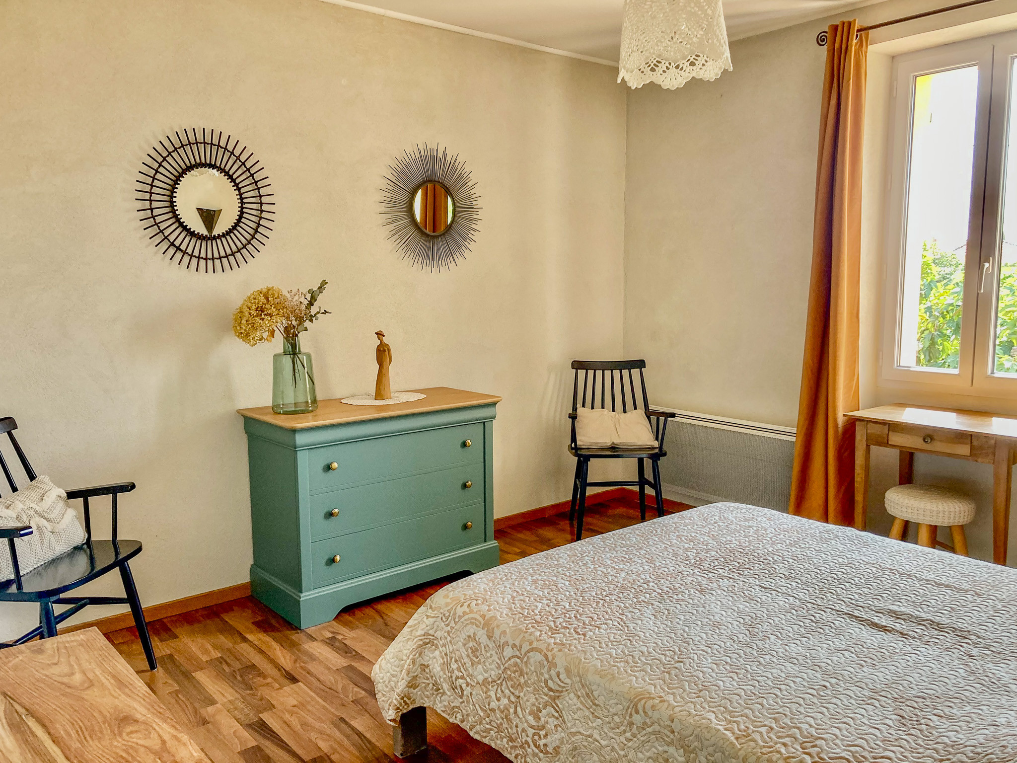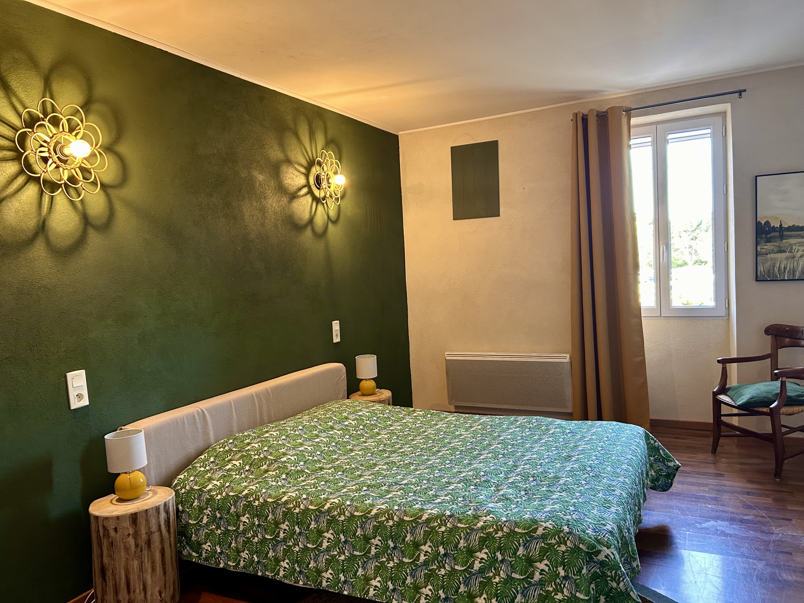 - Chambre 1 : lit double (140cm) + ventilateur de plafond
