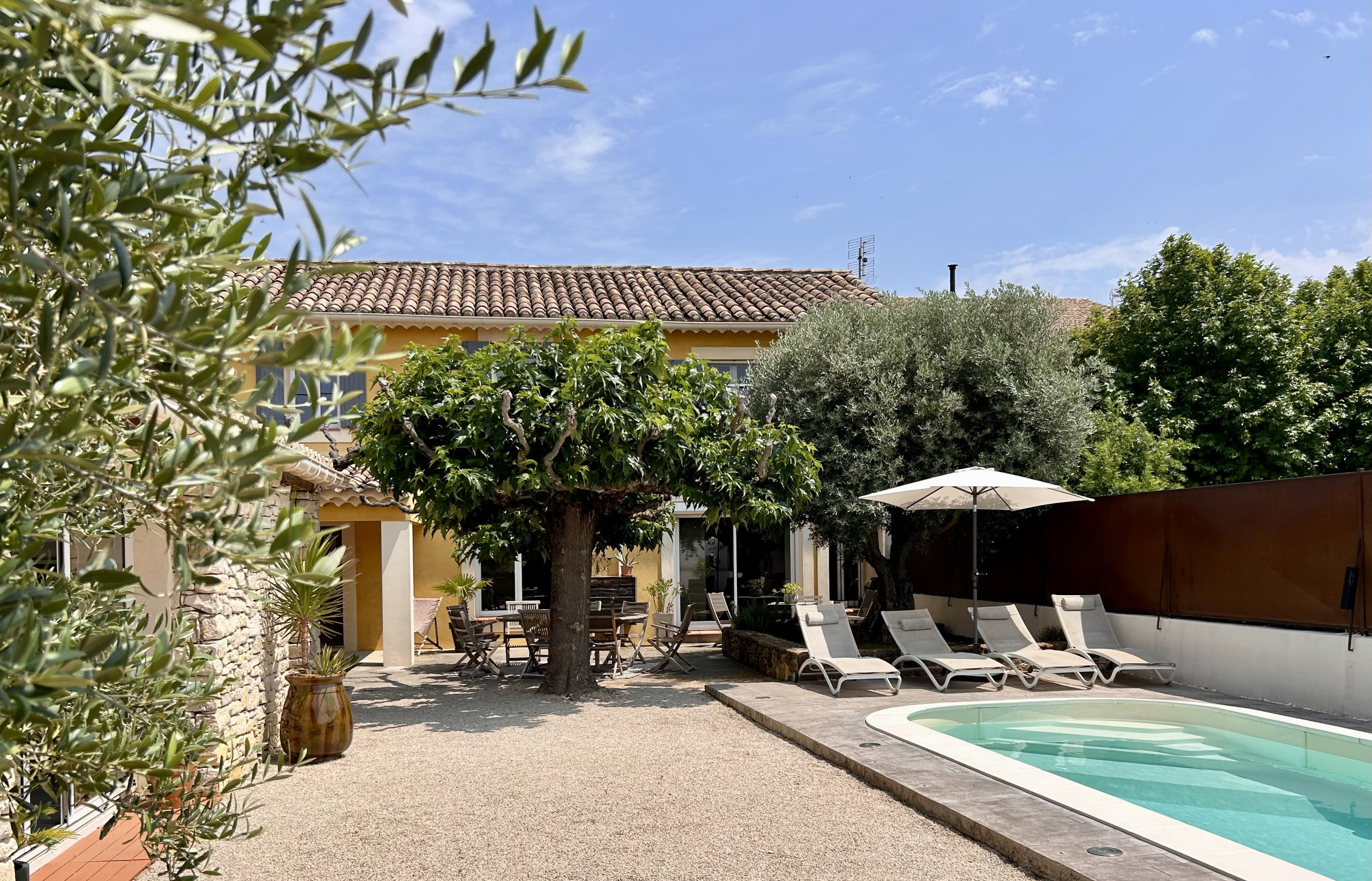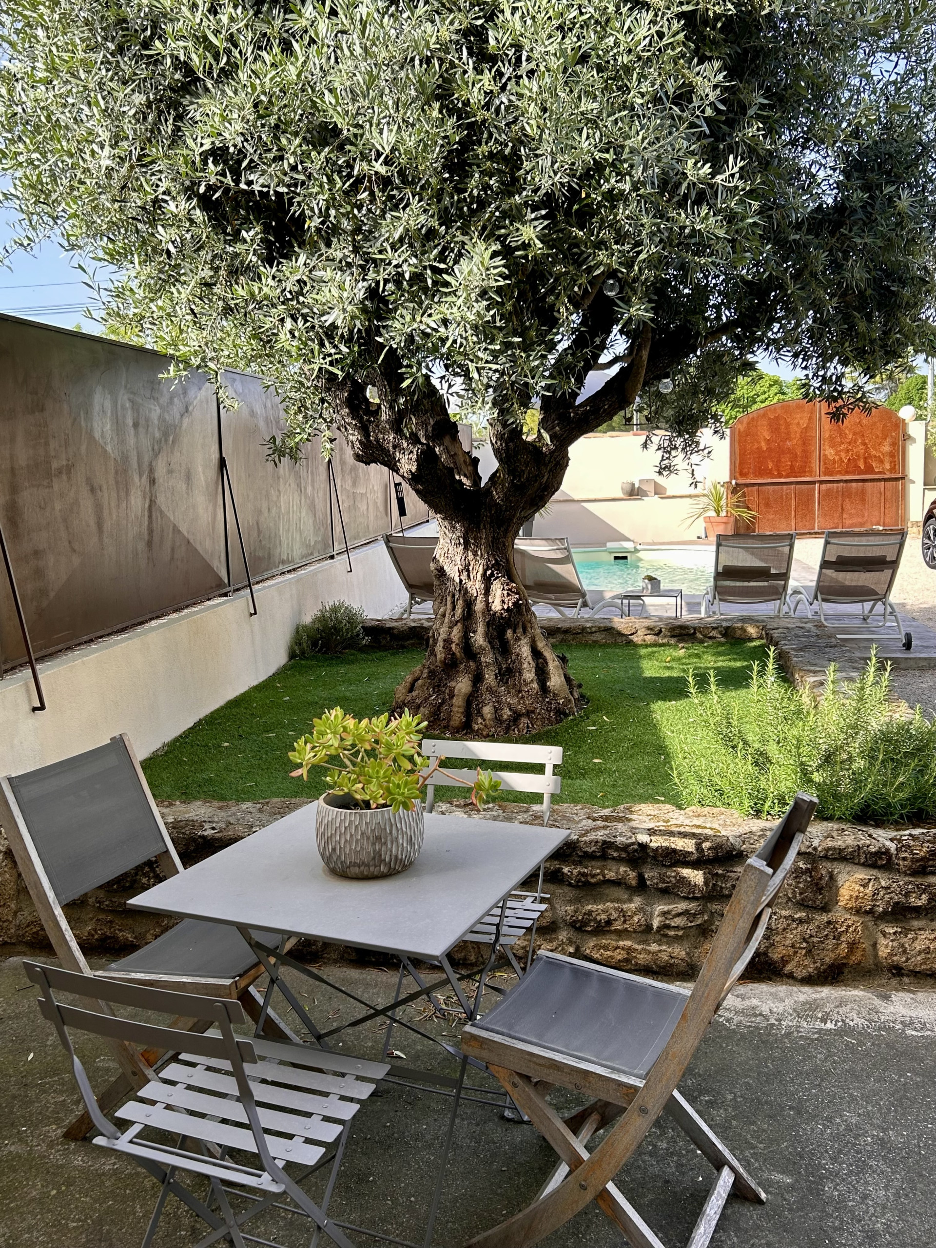 La terrasse ombragée par un magnifique mûrier platane est parfaite pour vos repas en extérieur (BBQ charbon + plancha électrique).