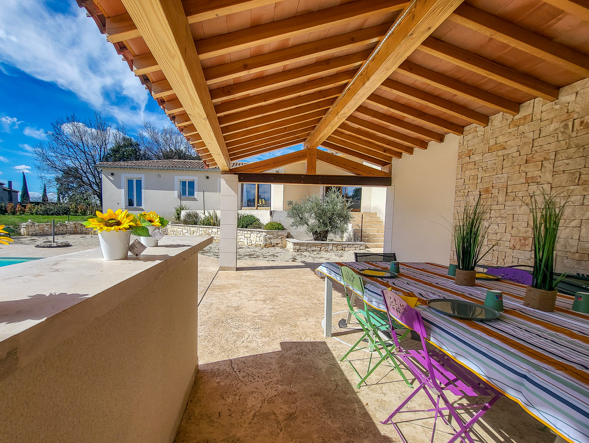 • Une terrasse couverte avec coin repas ombragé
