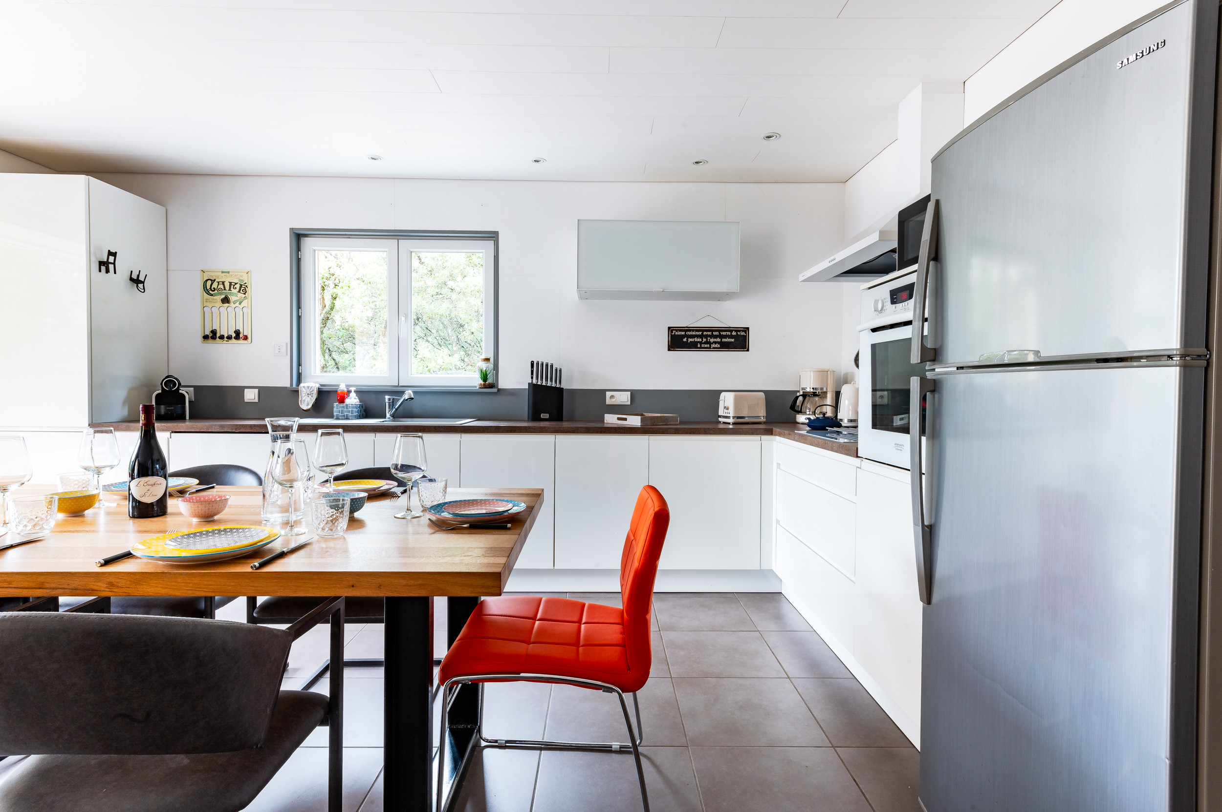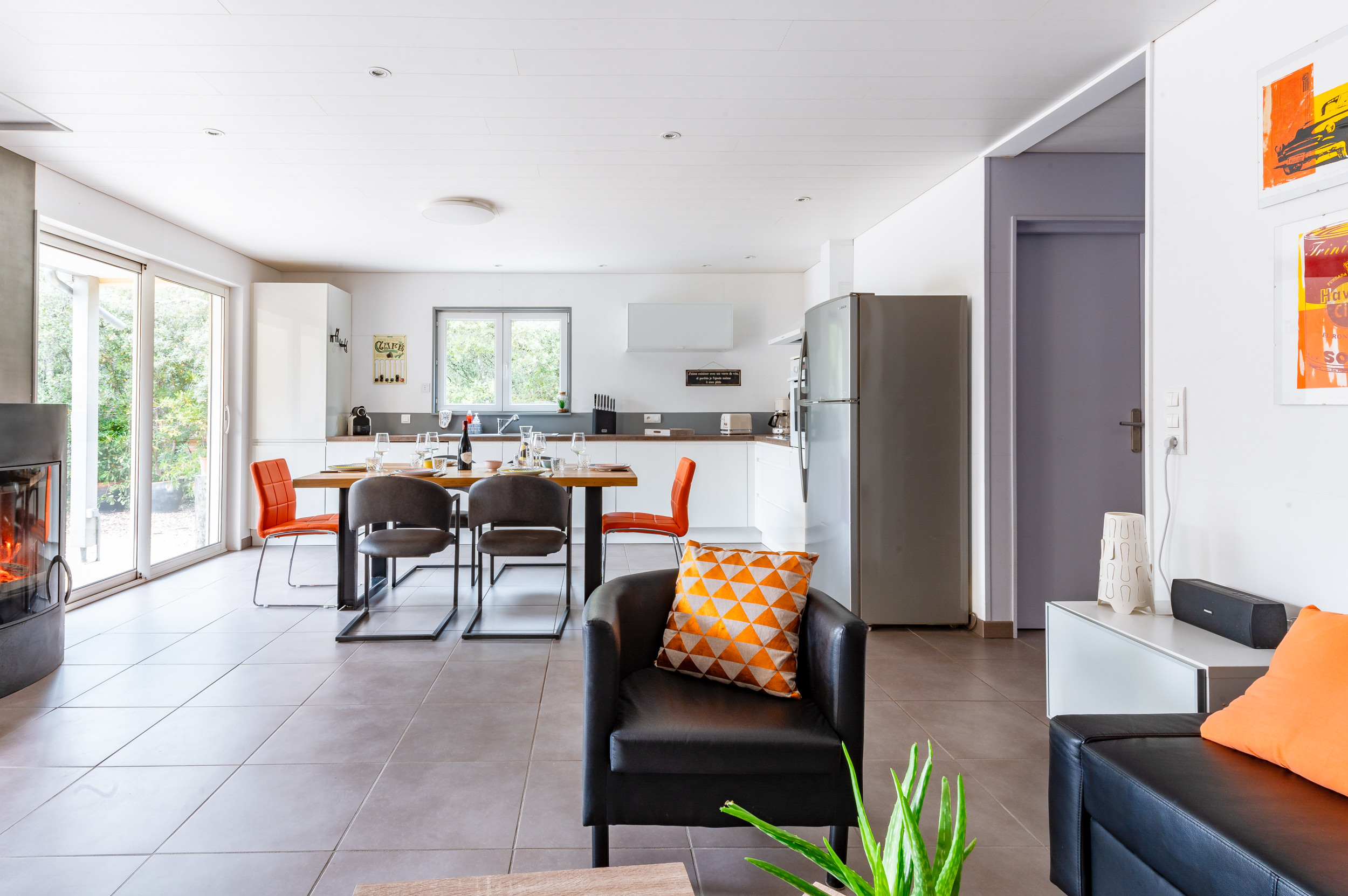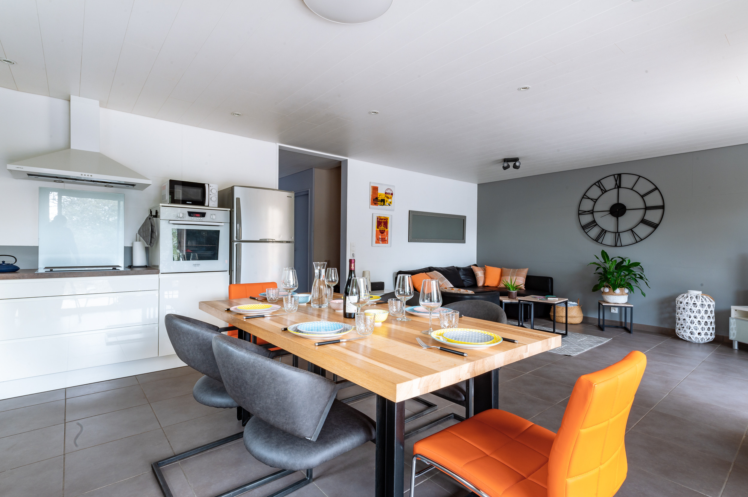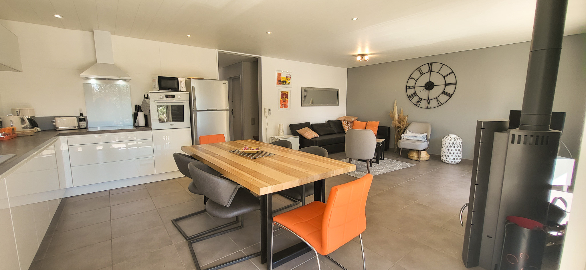o Un espace de vie climatisé, lumineux et ouvert : salon, cuisine équipée et coin repas (cafetière Nespresso)