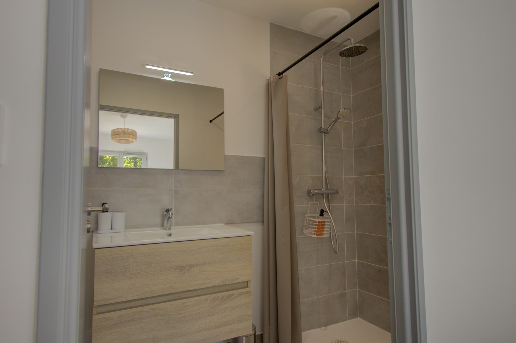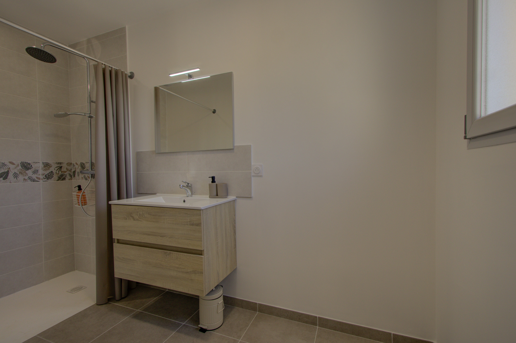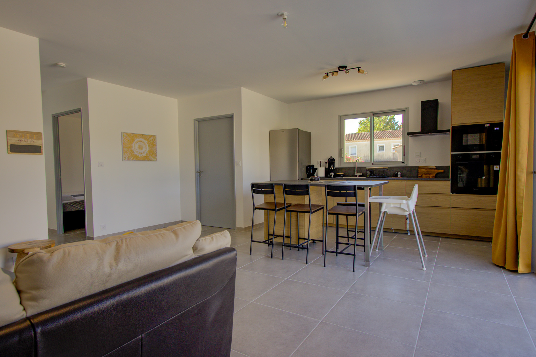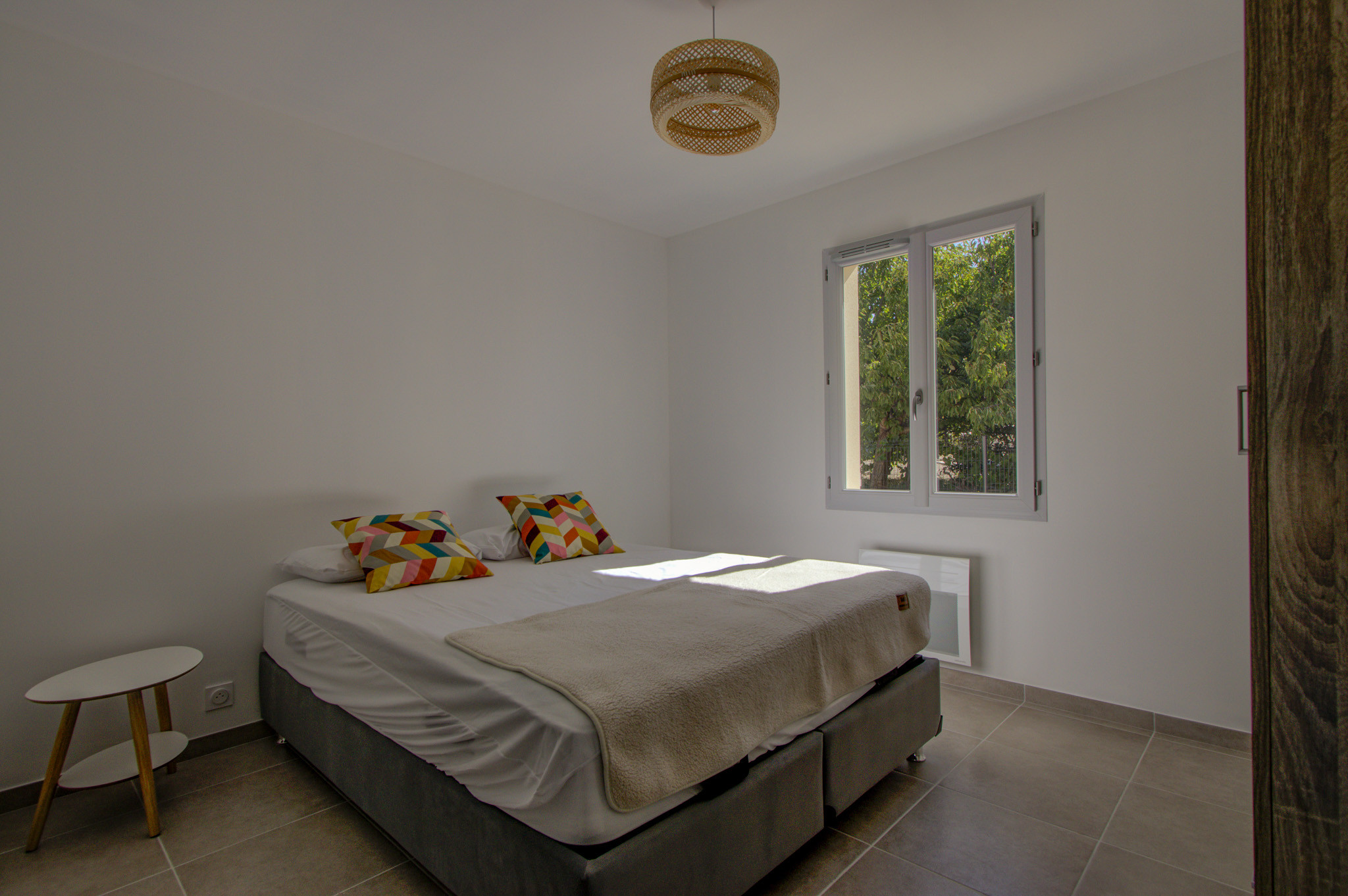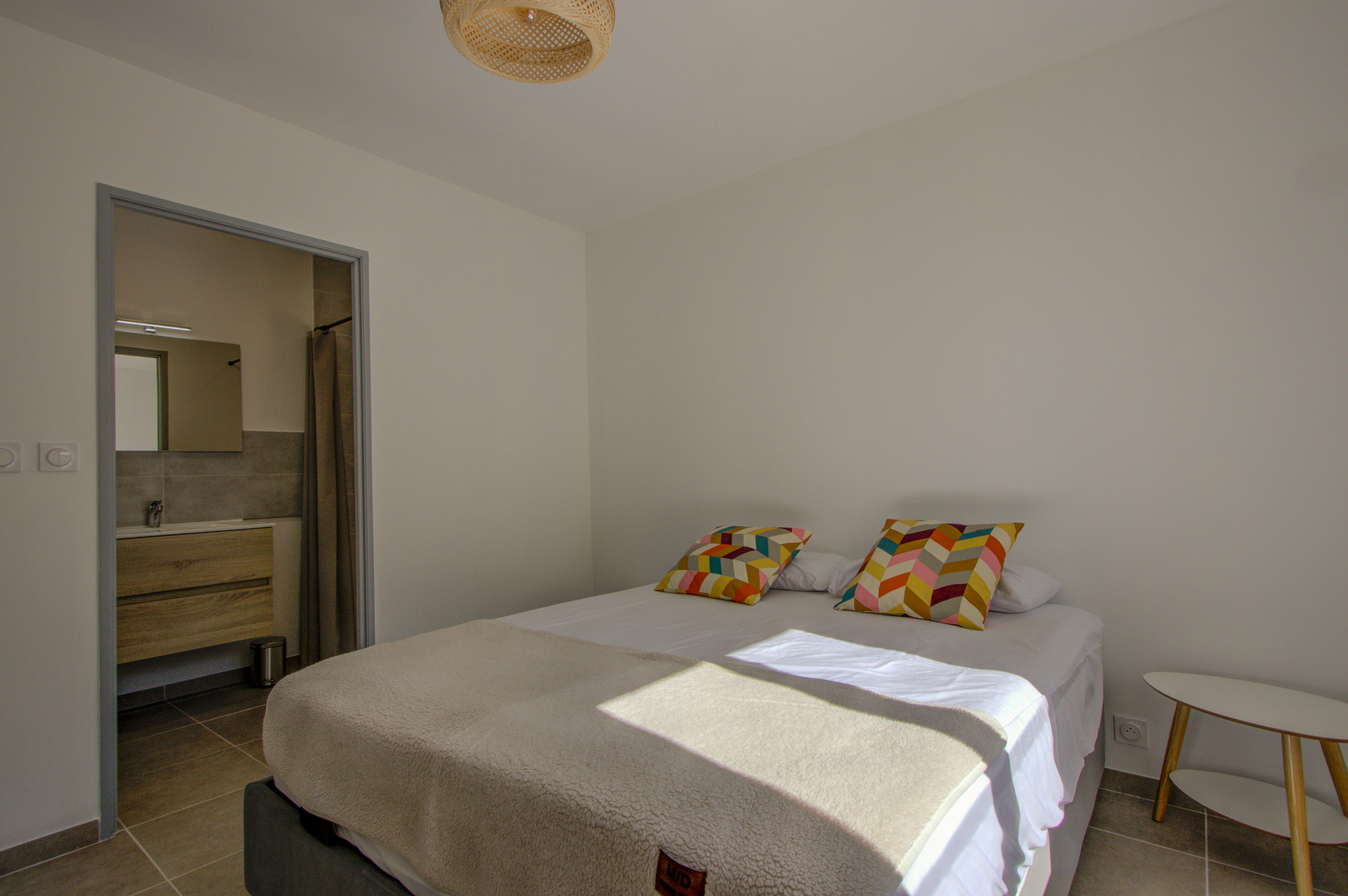 La pièce de vie, climatisée et baignée de lumière, réunit cuisine équipée, salle à manger et salon ouverts sur la terrasse et la piscine. Deux chambres, l’une avec lit 160 cm, l’autre avec deux lits 90 cm, disposent chacune de leur salle d’eau avec douche à l’italienne. Un WC indépendant et une buanderie avec lave-linge complètent l’ensemble.