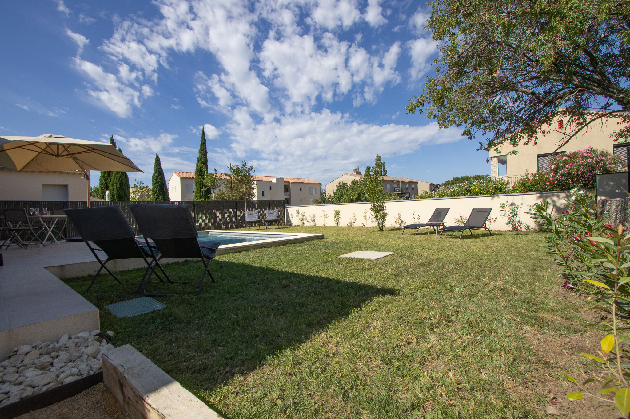 Un extérieur propice à la détente avec une piscine privative (3,5 x 5 m) pour vous rafraîchir pendant les chaudes journées d’été, une terrasse ombragée pour les repas en plein air et un terrain de pétanque pour des moments conviviaux.