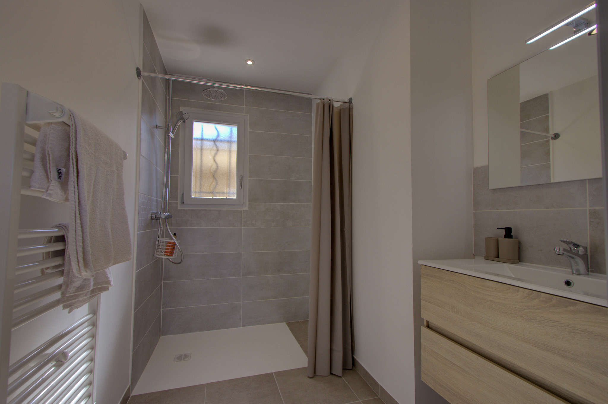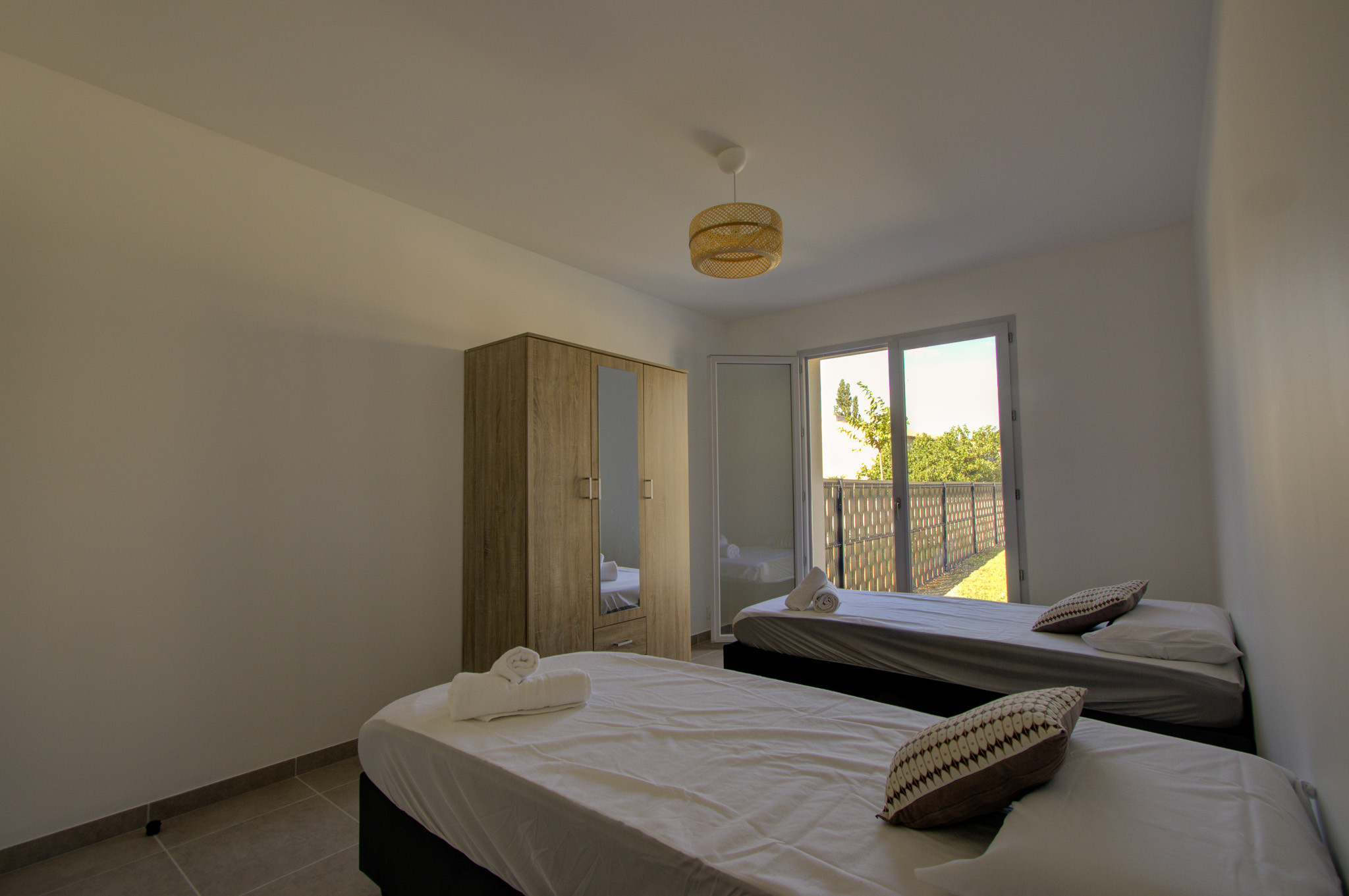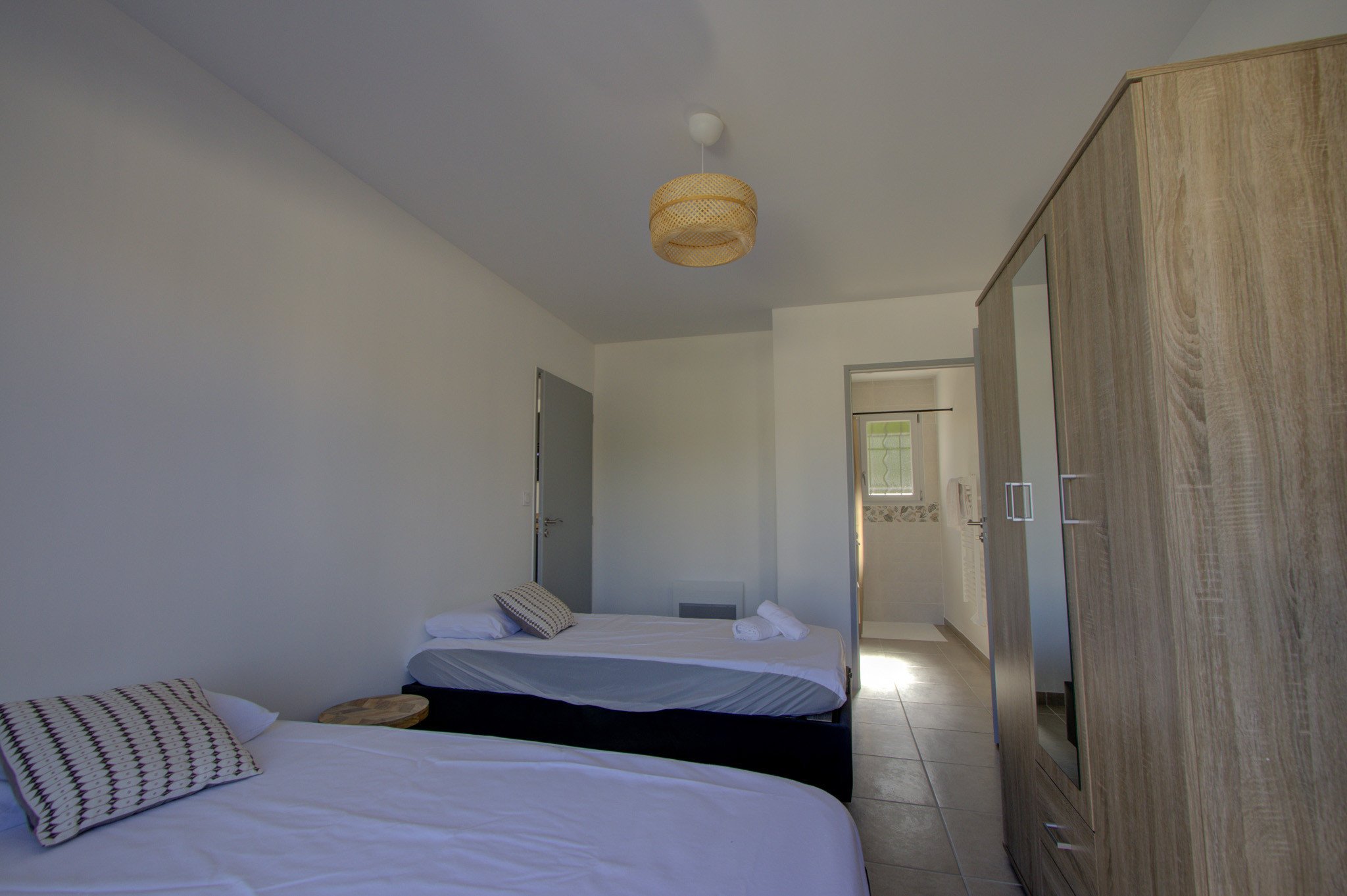 L’intérieur est fonctionnel et agréable : un séjour lumineux avec cuisine équipée, salle à manger et salon ouvrant sur la terrasse et la piscine, un WC indépendant avec un coin buanderie avec une machine à laver. Côté nuit : une chambre double et chambre avec deux lits simples, chacune avec sa propre salle d’eau.